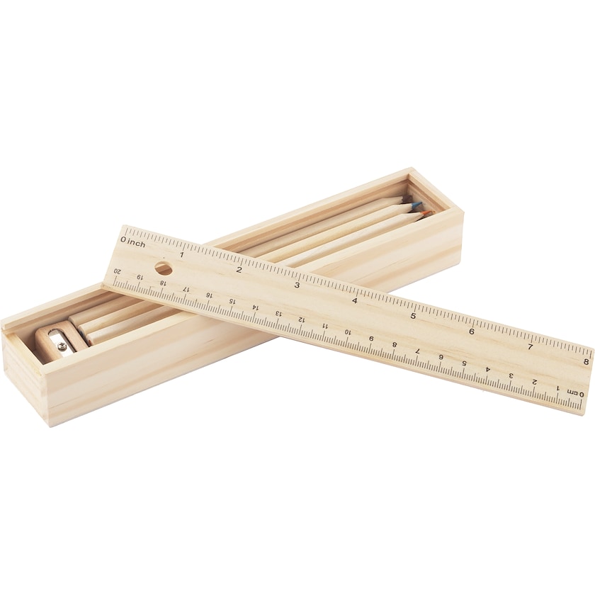 Set composto da 12 matite pastello, righello e gomma. Personalizzabile con logo sul righello.