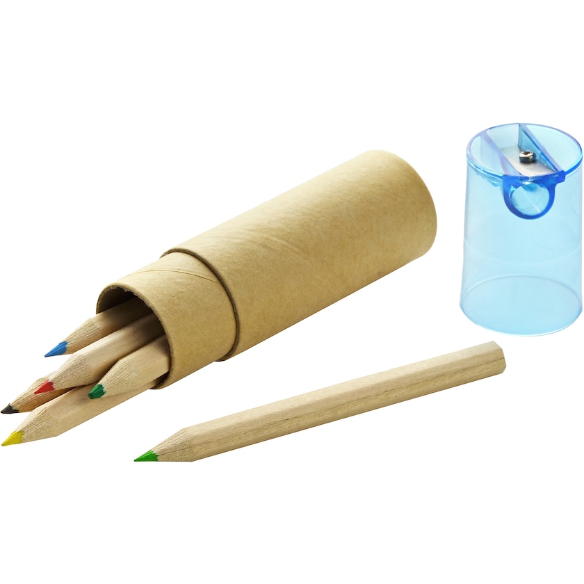 Tubo con 6 matite pastello e temperino sul tappo. Personalizzabile con stampa sul tubo di cartone.