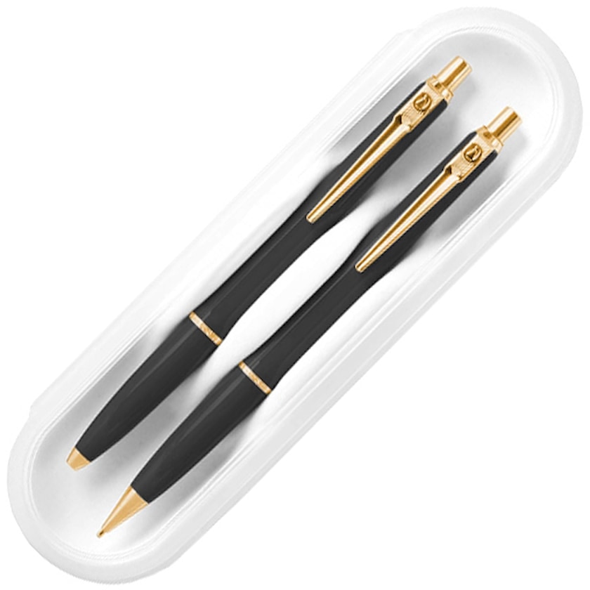 Set Ballograf Epoca P Luxe con penna a sfera e portamine. Le penne hanno dei dettagli dorati eleganti. Il prezzo di personalizzazione si riferisce su una delle penne. La penna a sfera è dotata di una cartuccia con inchiostro resistente all'archiviazione.