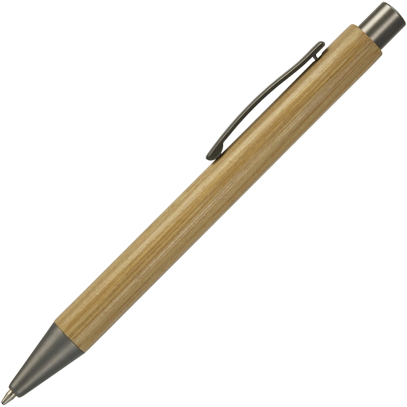 Penna in bambù con fermaglio in metallo. I dettagli sono laccati in colore metallico color grigio scuro. Questa penna è un'ottima scelta per l'ambiente perché è il bambù è un materiale ecologico e prodotto ad alta efficienza energetica.