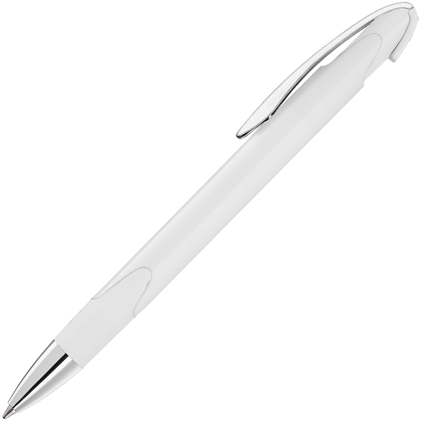 Penna in plastica con fusto colorato, dettagli cromati e comoda impugnatura.