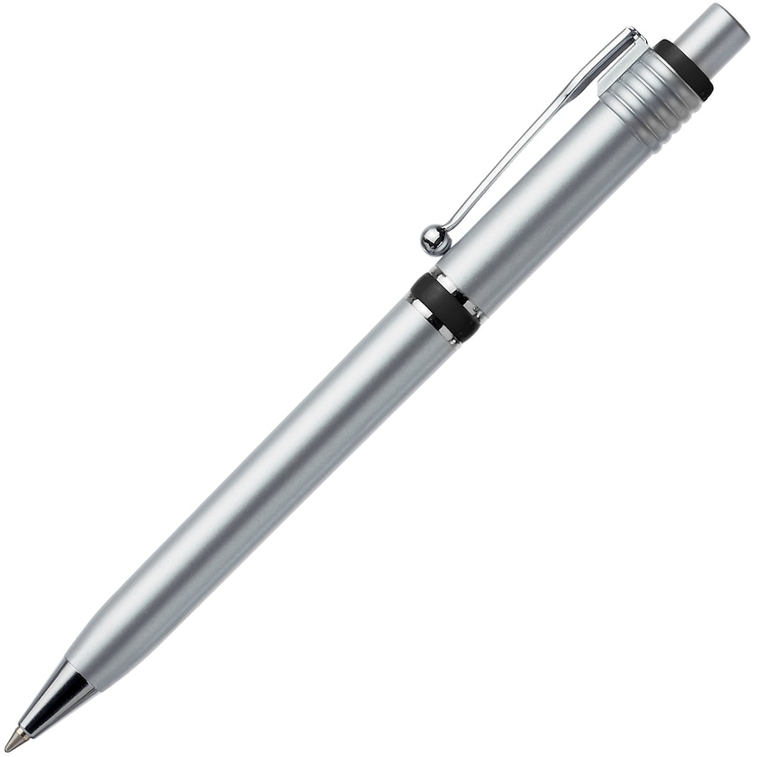 Penna a sfera in plastica argentata con una clip un po' insolita.