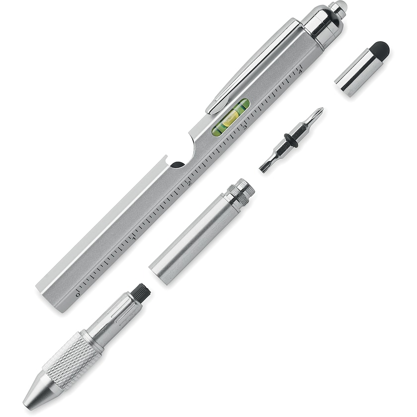 Penna in acciaio inox con molte funzioni itelligenti. Catlin comprende oltre alla penna anche un righello, una livella a bolla d'aria, bits per cacciaviti Philips e a testa piatta e una torcia. 3 batterie AG incluse. Il miglior amico degli artigiani!