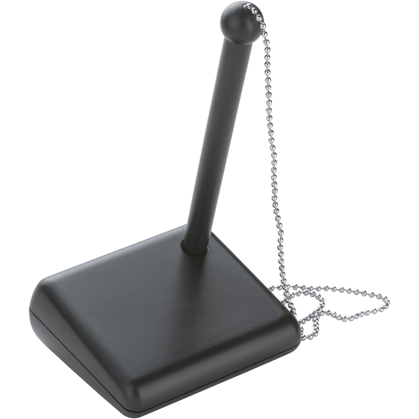 Penna con catenella attaccata ad un supporto. Personalizzabile con stampa sulla penna o sul supporto. La catenella è di metallo ed è lunga 50 cm. Confezionata in scatola regalo argentata.
