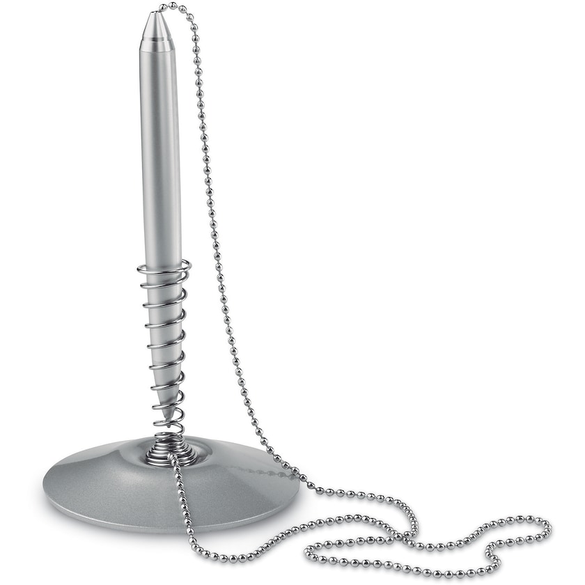 Penna con catenella e supporto a spirale. Una bella penna in alluminio con inchiostro blu.