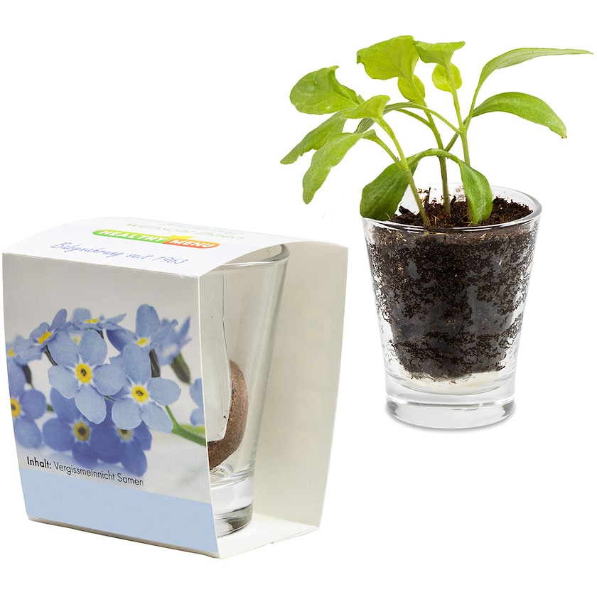 Bicchiere con terra e semi. Perfetto per coltivare in ufficio. Scegli tra un'ampia gamma di tipi di semi. La personalizzazione viene realizzata su una fascia di carta che viene posizionata intorno al bicchiere.