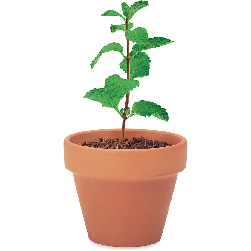 Vaso in terracotta con dischi di torba e semi di menta. La personalizzazione viene realizzata con stampa a un colore solo o con incisione a laser. Prodotto nella UE.