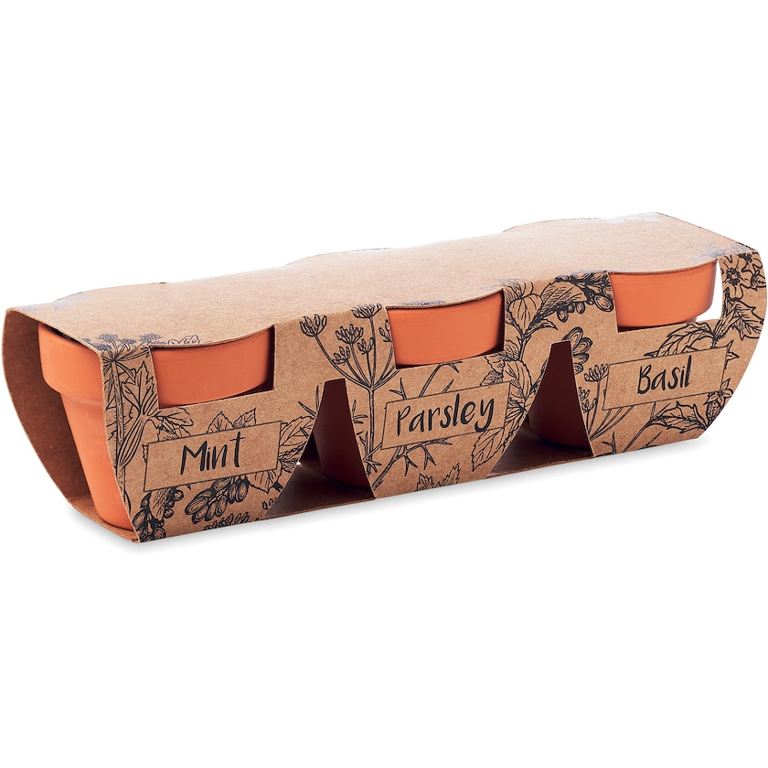 Coltiva il tuo piccolo orticello! Set di tre vasi che contengono semi per coltivare menta, prezzemolo e basilico. Aggiungi sapore ai tuoi piatti! Prodotto UE. É solo possibile la stampa a un colore.