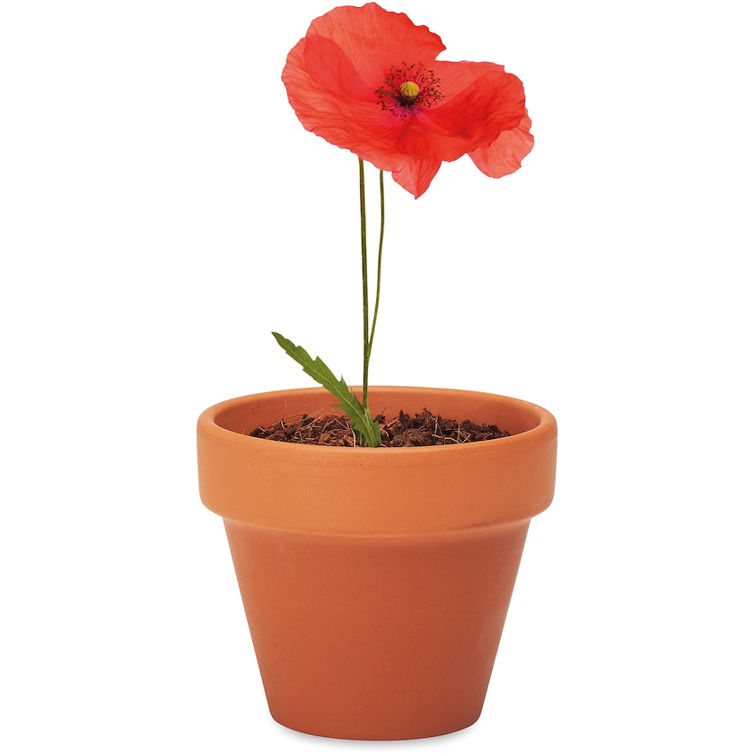 Vasetto da fiori con seme di papavero. Il logo può essere stampato o inciso a laser sul vasetto oppure realizzato con stampa sul lato superiore della scatola di carta. È solo possibile la stampa a un colore. Prodotto in UE. La scelta giusta per chi cerco un vasetto da fiori personalizzato!