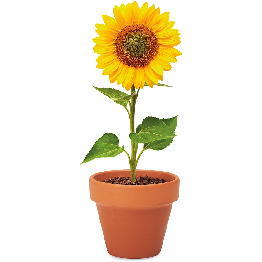 Piccolo vaso con seme di girasole. Il logo può essere stampato o inciso a laser sul vasetto oppure realizzato con stampa sul lato superiore della scatola di carta. La stampa è possibile in massimo un colore. Prodotto in UE. Fallo fiorire!