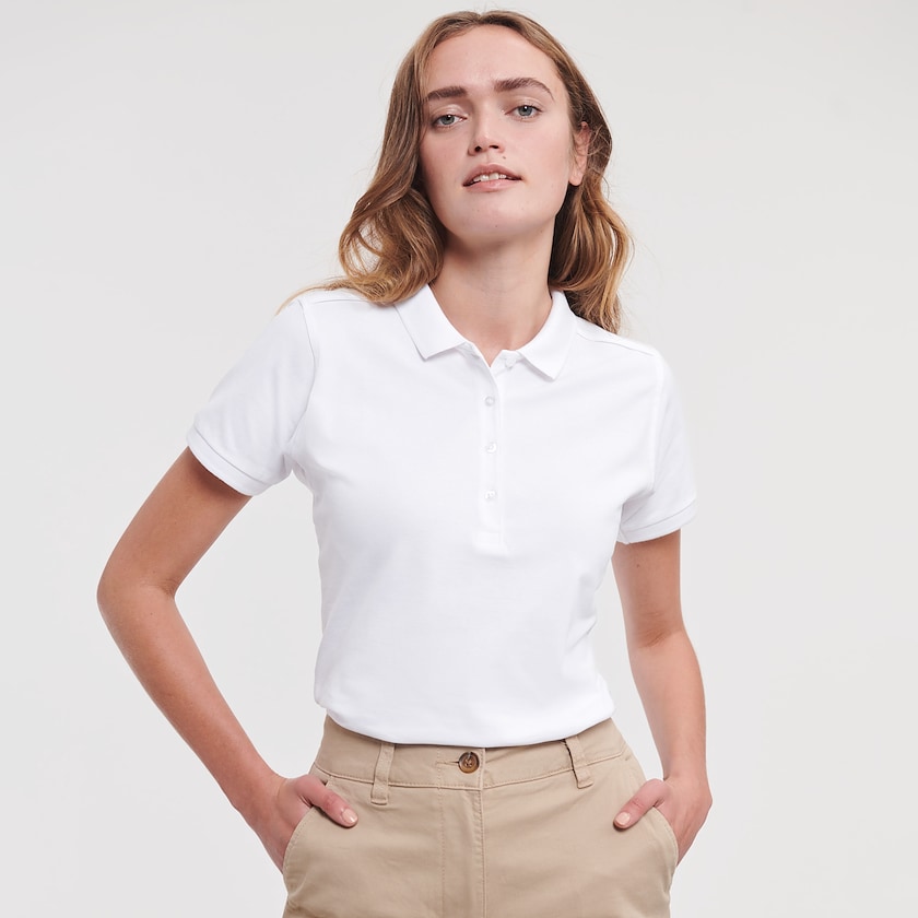 Polo da donna slim elasticizzata. Il tessuto è realizzato in 5% lycra ed è per questo che è così avvolgente e piacevole da indossare. La polo viene confezionata singolarmente in una busta di plastica. Disponibile anche in versione da uomo.