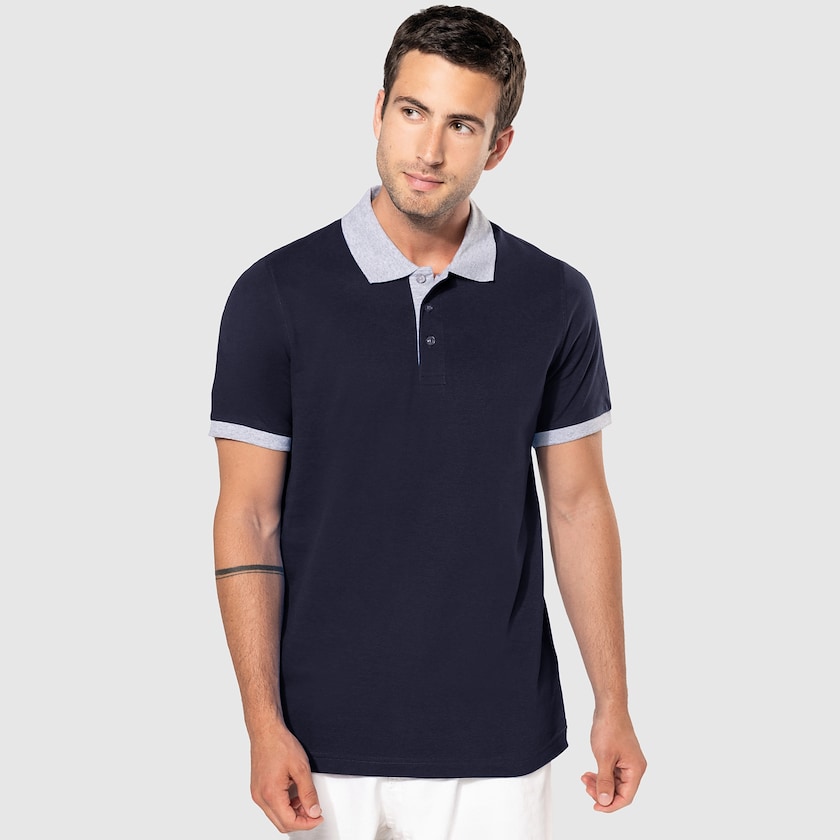Polo dal bel design con colletto e bordo delle maniche colorati a contrasto. È realizzata in 100% cotone ad eccezione del colore oxford grey, che è in 90% cotone e 10% viscosa. Ogni polo viene confezionata singolarmente in una busta di plastica. Disponibile anche in versione da donna.