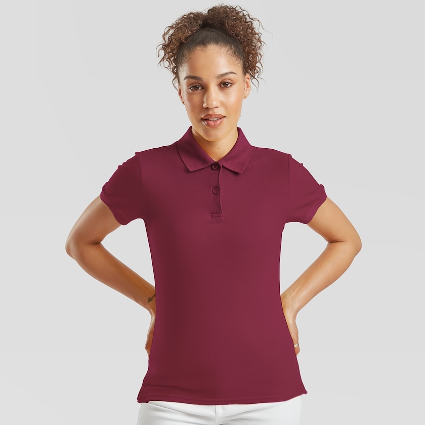 Polo aderente in versione da donna, di marca Fruit of the Loom. FOTL Lady-Fit Premium Polo è realizzata in 100% cotone da 180 g/m². Confezionata singolarmente in busta di plastica. Disponibile anche in versione da uomo.