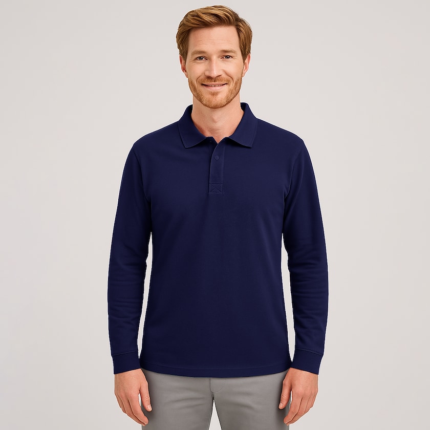 Polo a maniche lunghe da uomo personalizzata. Questa polo è realizzata in resistente tessuto di cotone con grammatura di 200 gr. Il colletto si chiude con due bottoni intonati alla polo. Disponibile anche in versione da donna.