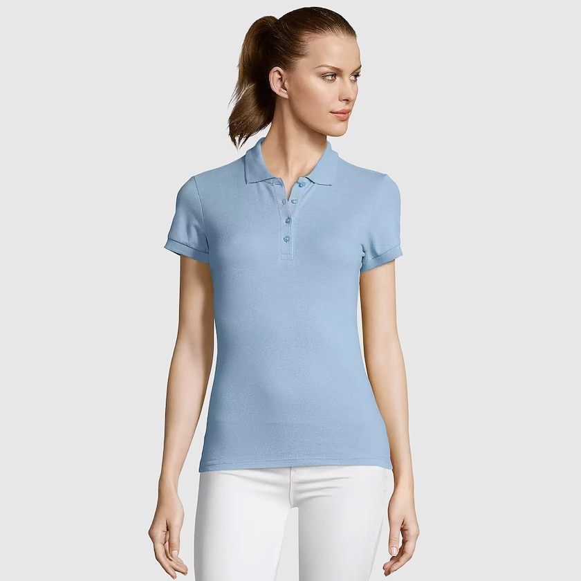 Polo da donna economica disponibile in tantissimi colori diversi. Il tessuto è realizzato in 100% cotone con grammatura 170g/m² ed è certificato ÖKO-TEX. Sul colletto sono posizionati 4 bei bottoni intonati al colore della polo. Disponibile anche in versione da uomo.