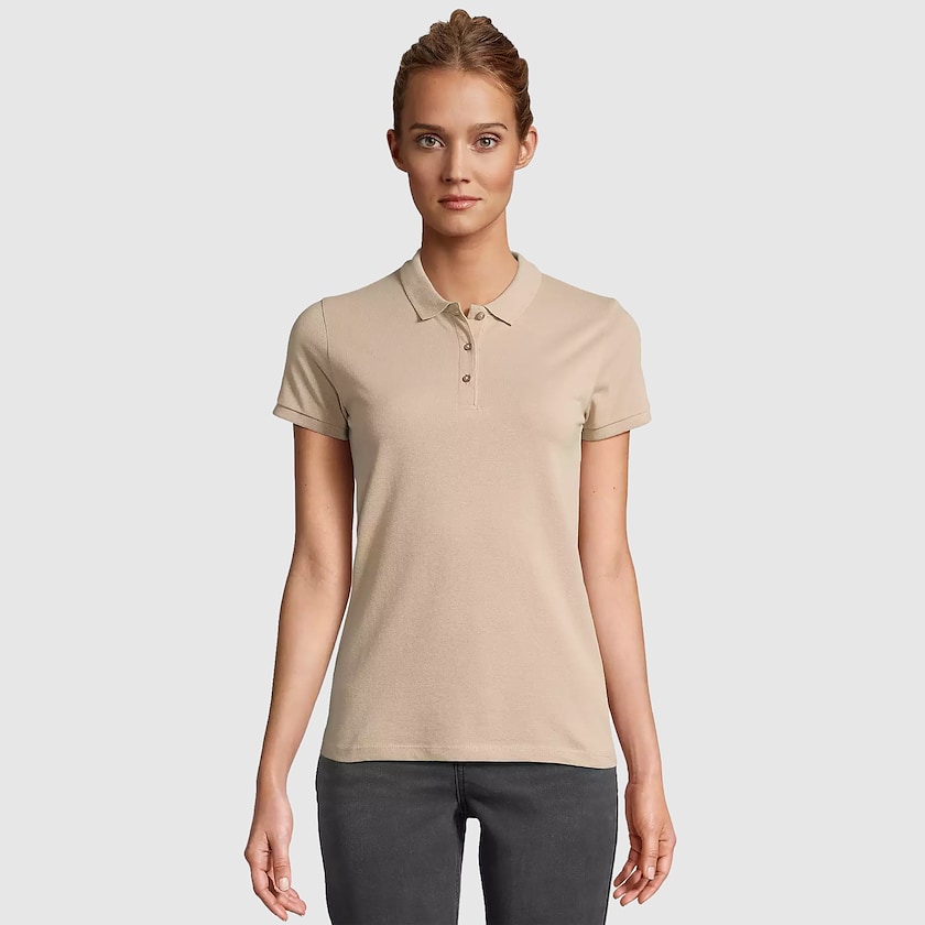 Polo da donna in cotone biologico pettinato da 170 grammi. La polo è dotata di tre bottoni intonati. È realizzata in tessuto certificato ÖKO-TEX. Disponibile anche in versione da uomo.
