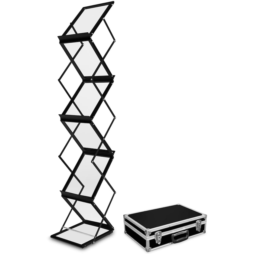 Porta opuscoli Flex in alluminio nero con borsa robusta. Il porta opuscoli è realizzato in alluminio nero con verniciatura a polvere ed è dotato di 6 scomparti per opuscoli. Ogni scomparto misura 30,5 x 22 cm. Completamente aperto il porta opuscoli è alto 146 cm mentre una volta chiuso misura 17 x 54 x 47 cm. Il montaggio è rapido e non richiede alcun attrezzo. Il montaggio è rapido e non richiede alcun attrezzo. Consegnato con una robusta custodia in alluminio. 1 anno di garanzia.