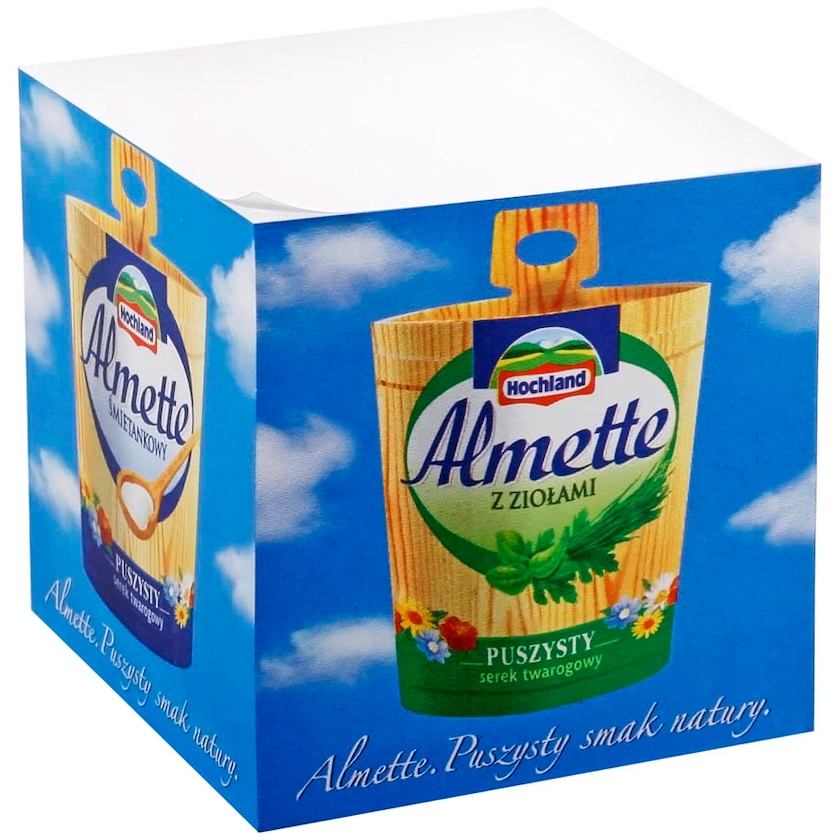Grande cubo memo con 900 foglietti. Il prezzo di stampa include la stampa digitale su tutti i lati del cubo e su tutti i fogli. Il cubo è incollato su di un lato, ma i singoli fogli non hanno una striscia adesiva.