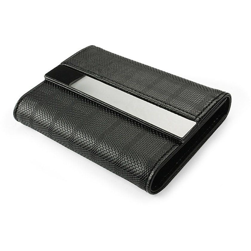 Elegante portabiglietti da visita in pelle sintetica, con spazio per 20 biglietti. Personalizzabile con incisione laser sulla lastra in metallo applicata sul davanti.