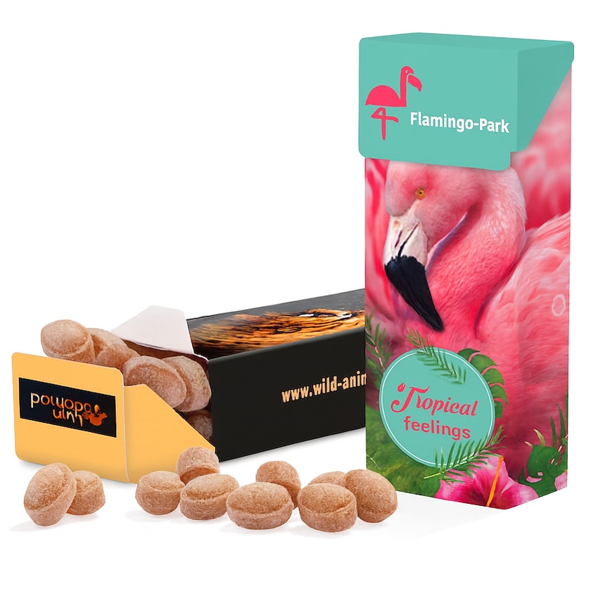 Moderna scatolina con 25 grammi di caramelle di qualità superiore. La scatolina viene stampata in digitale e ricoperta di cellofan protettivo. Personalizza la tua scatolina con la grafica che vuoi tu (vedi campione di stampa).