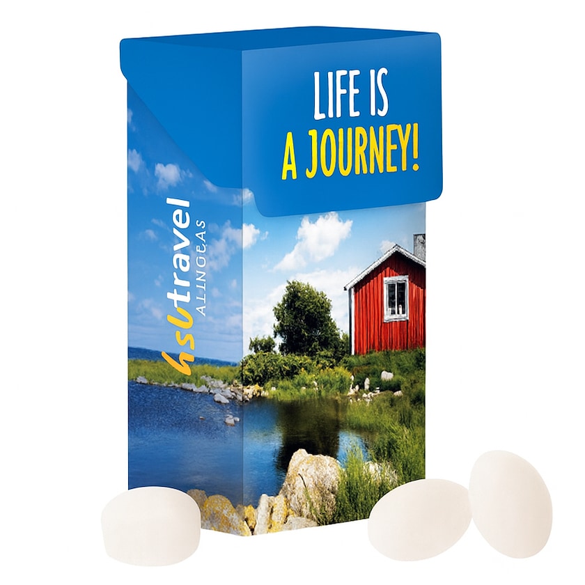 Scatolina con 10 grammi di deliziose caramelle. La scatolina viene personalizzata con stampa digitale e avvolta in cellofan protettivo. Puoi personalizzare l'intera scatola con la tua grafica (vedi campione di stampa).