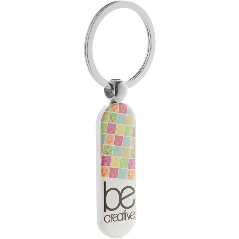 Portachiavi ovale in metallo con stampa digitale. Il portachiavi è cromato e viene fornito in una confezione regalo nera.