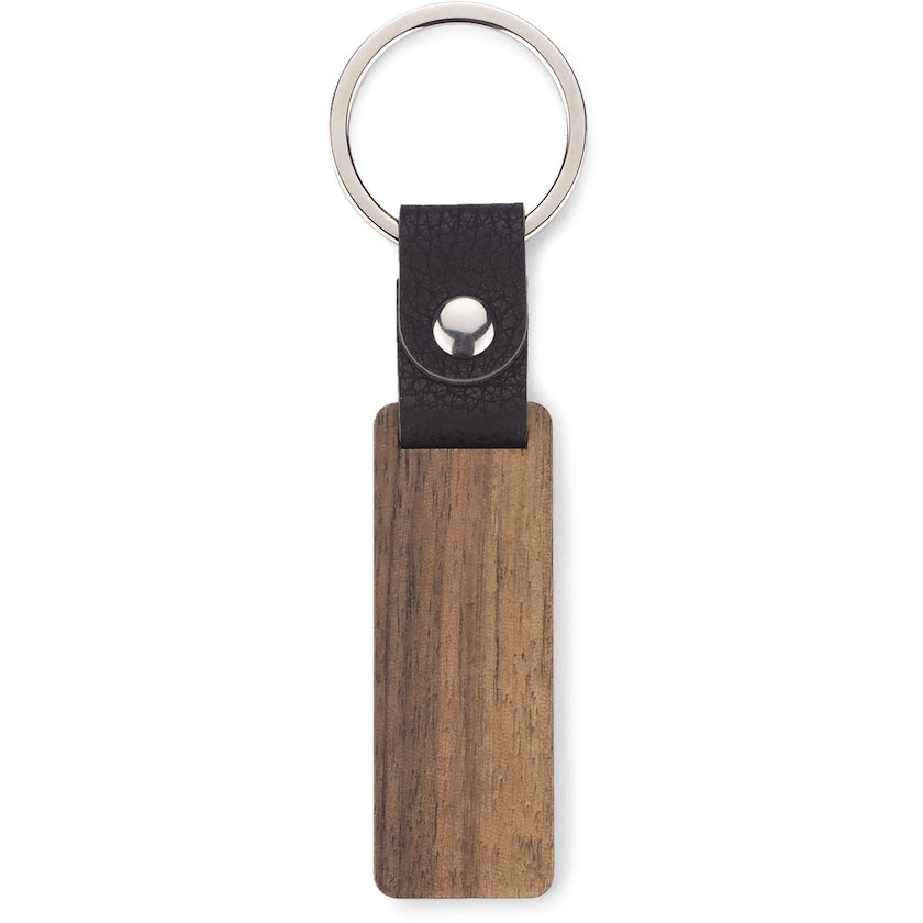 Esclusivo portachiavi in legno di noce, metallo e cuoio. Personalizzabile con stampa o incisione a laser.