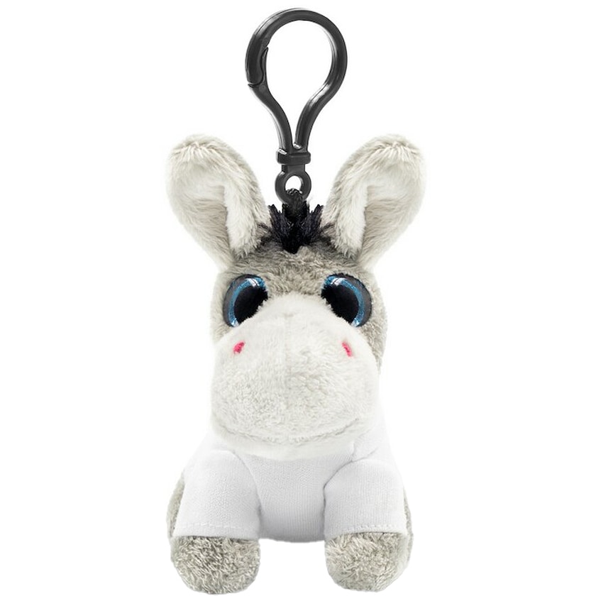 Un asinello dolcissimo. L'asinello indossa una maglietta bianca. Il grande gancio in plastica rende il peluche facile da attaccare a una borsa o uno zaino.