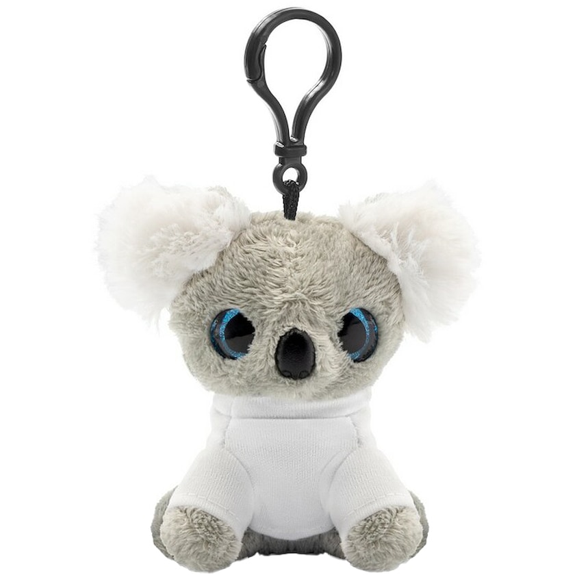 Dolce koala in peluche con maglietta bianca e gancio in plastica nera. Il gancio lo rende perfetto da attaccare ad esempio a una borsa o uno zaino.