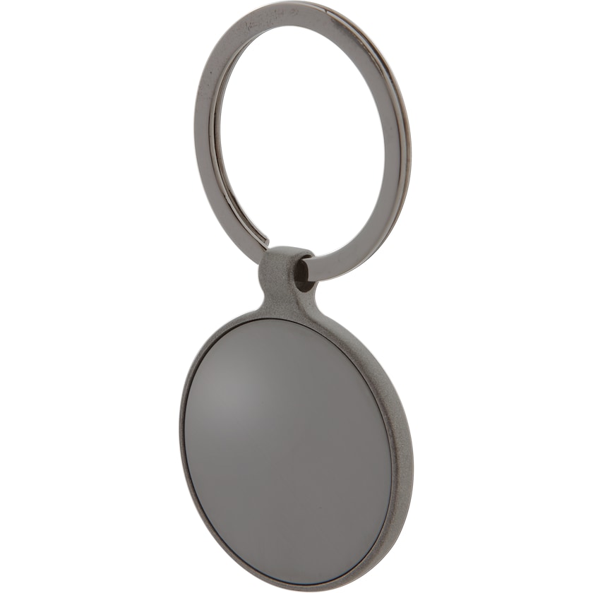 Portachiavi di metallo rotondo in finitura gun metal. Entrambi i dischi sono lucidi e il resto del portachiavi è opaco. La personalizzazione viene realizzata con incisione a laser. Il portachiavi viene consegnato in una scatola regalo nera.