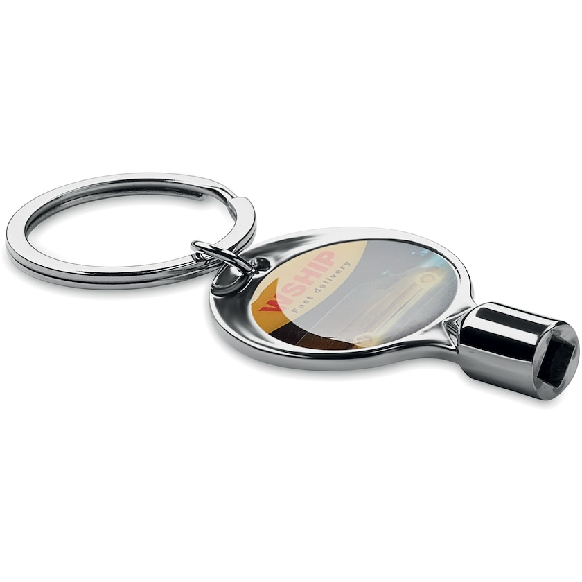 Chiave di sfiato con portachiavi. Il tuo logo viene stampato digitalmente su un lato ed å dotato di uno strato protettivo di resina epossidica. Consegnato confezionato individualmente in una busta di carta velina. Un gadget perfetto per ad esempio aziende di servizi idrici e società immobiliari.
