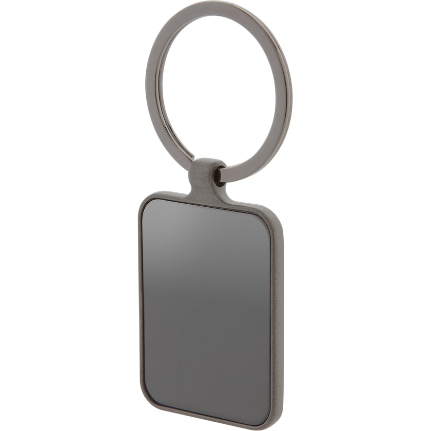 Portachiavi di metallo rettangolare con finitura gun metal. Entrambe le placche sono lucide e il resto del portachiavi è opaco. Consegnato in una scatola regalo nera.