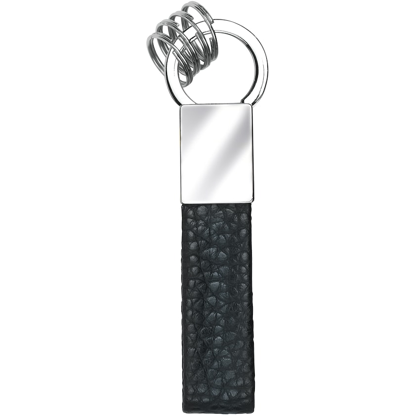 Portachiavi in metallo e in simil pelle. Il portachiavi è anche dotato di alcuni anelli piccoli. Il logo può essere stampato oppure inciso a laser.