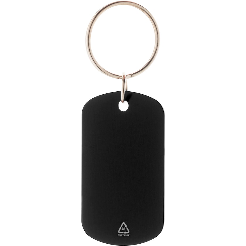 Portachiavi in alluminio riciclato. Un portachiavi essenziale che è una buona scelta per l'ambiente. Sul retro si trova un simbolo che mostra che è realizzato solo in alluminio riciclato.