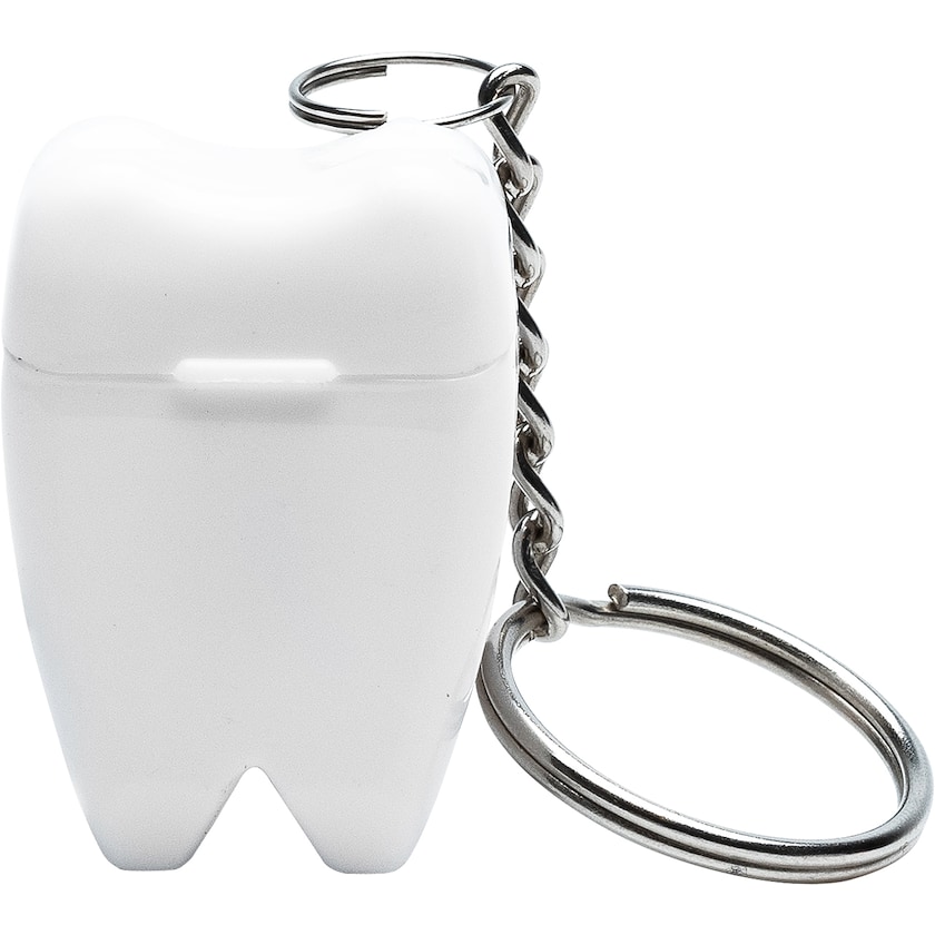 Portachiavi a forma di dente contenente 5 metri di filo interdentale. Aiuta a tenere la bocca fresca ovunque ci si trovi. Un eccellente gadget personalizzato per dentisti.