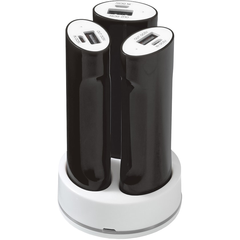 Set con 3 powerbank che vengono ricaricati con una dockingstation. Ricarica i powerbank per tutta la famiglia allo stesso tempo. Cavo per la dockingstation è incluso. Ogni powerbank ha una capacità di 2.200 mAh. Il prezzo di stampa si riferisce alla personalizzazione di un powerbank.