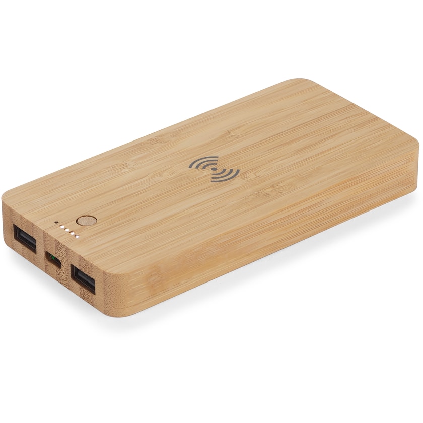 Powerbank in bambù con ricarica senza fili. Scegli tra stampa e incisione a laser. Consegnata in una scatola di carta color naturale.