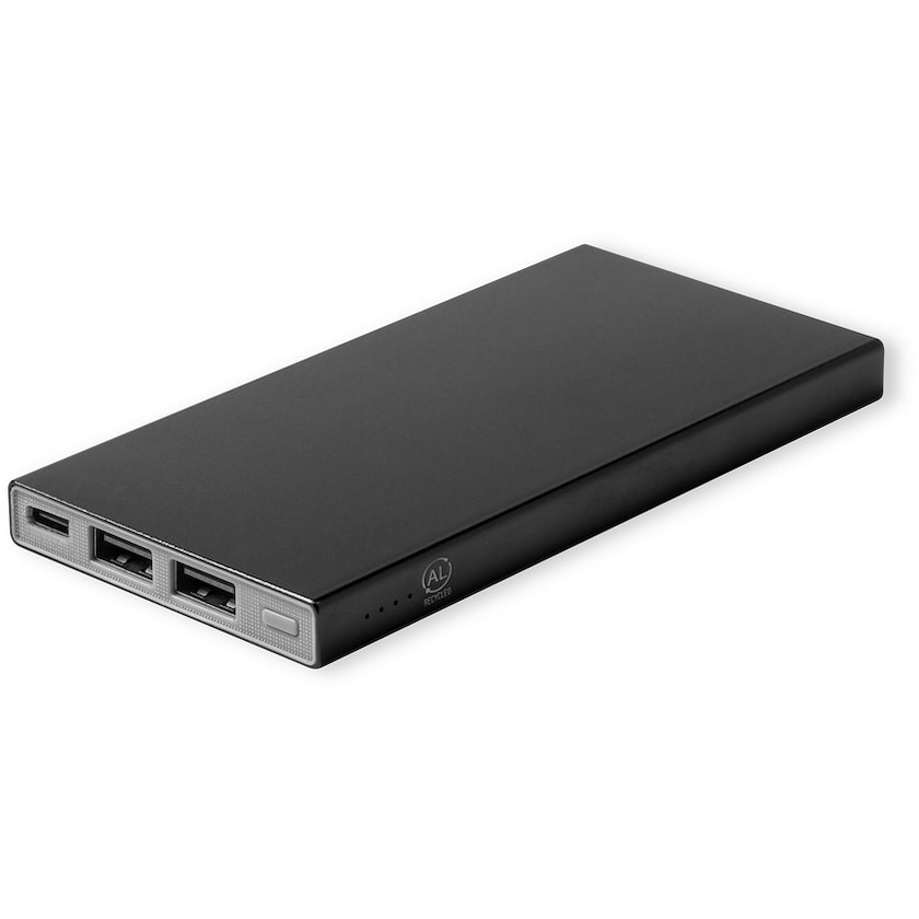 Powerbank in alluminio riciclato. Il powerbank ha quattro diodi che mostrano il livello di energia rimanente. Cavo USB di tipo C incluso. La personalizzazione viene realizzata tramite incisione laser.