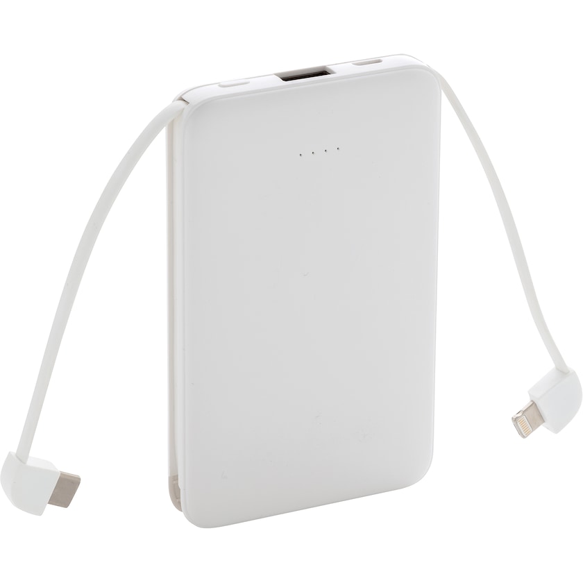 Powerbank compatto con cavi integrati. Può caricare il tuo telefono cellulare fino a due volte con una ricarica. Un indicatore segnala quando è il momento di caricare nuovamente il powerbank. Input: 5V/2A. Output: 5V/2A.