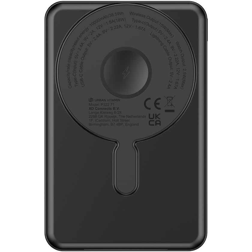 Potente powerbank con ricarica magnetica veloce e senza fili. La ricarica può anche avvenire attraverso la porta USB-C o il cavo lightning incorporato, aumentando ulteriormente la velocità di ricarica. Il powerbank ha un supporto fungendo anche da supporto per cellulare. La stampa viene realizzata sul supporto.