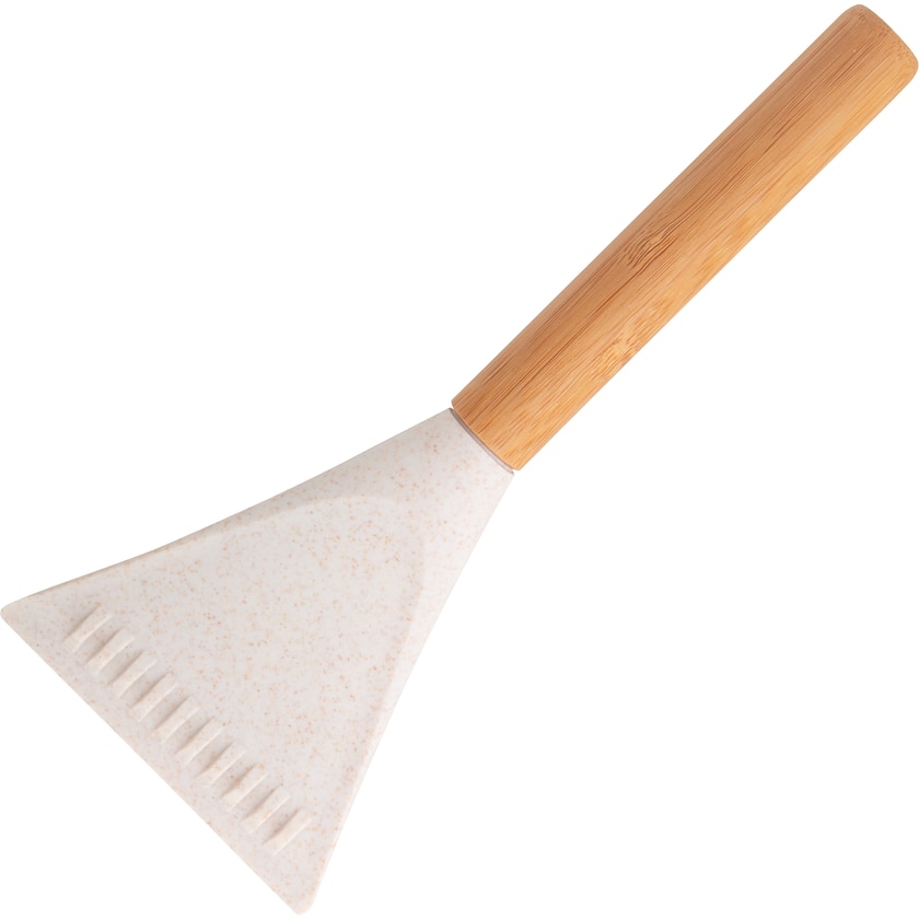 Raschiaghiaccio ecologico con manico grande. Il manico è realizzato in bambù, mentre il raschiaghiaccio in sé è composto di un mix di paglia di fieno, un materiale biologico, e di polistirene.