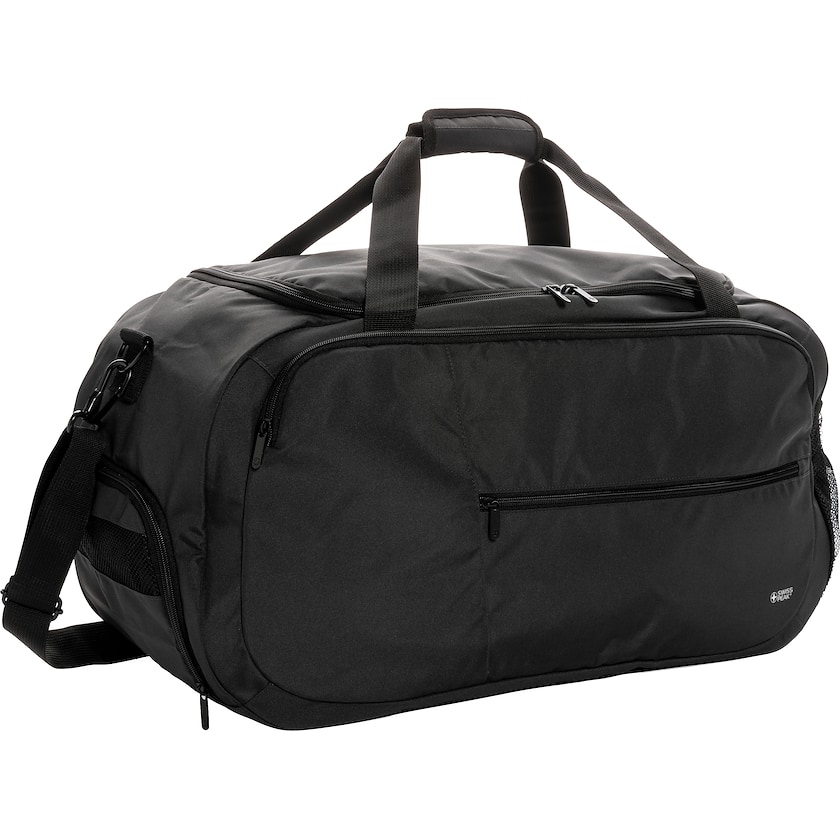 Borsa sportiva ecologica in materiale riciclato. Questa borsa sportiva, oltre allo scomparto principale, è dotata anche di una tasca frontale con cerniera e di una tasca a rete esterna. La borsa è realizzata in rPET, ossia in bottiglie di PET riciclate.