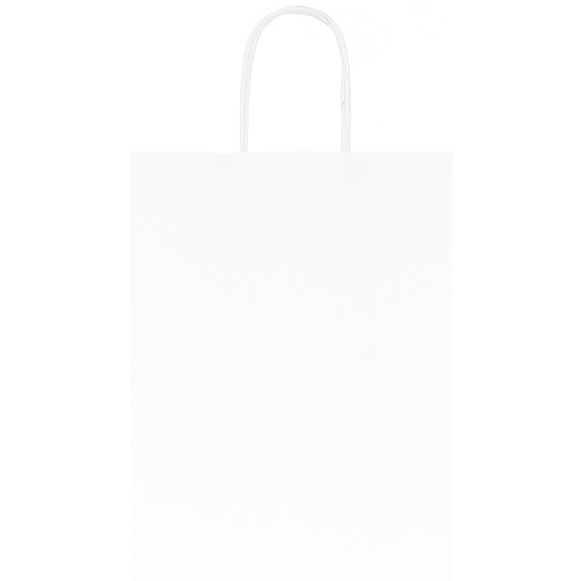 Sacchetto di carta bianco con stampa digitale. I manici sono ritorti e rinforzati. Il sacchetto di carta resiste a un massimo di 6 kg di peso. Dato che la stampa viene realizzata digitalmente, il tempo di consegna è corto.