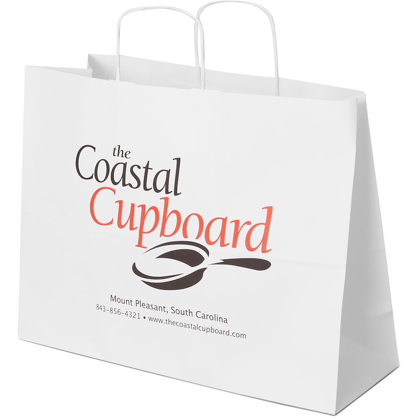 Grande borsa di carta con stampa personalizzata sull'intera superficie esterna. Questa borsa di carta è realizzata in carta liscia da 100 grammi. I manici sono ritorti. Scarica il modello di stampa e disegnala tu stesso. L'ordine minimo è di 3000 pz. La quantità prodotta può differire del +15% o -15% dall'ordine. Viene fatturata la quantità effettivamente consegnata.