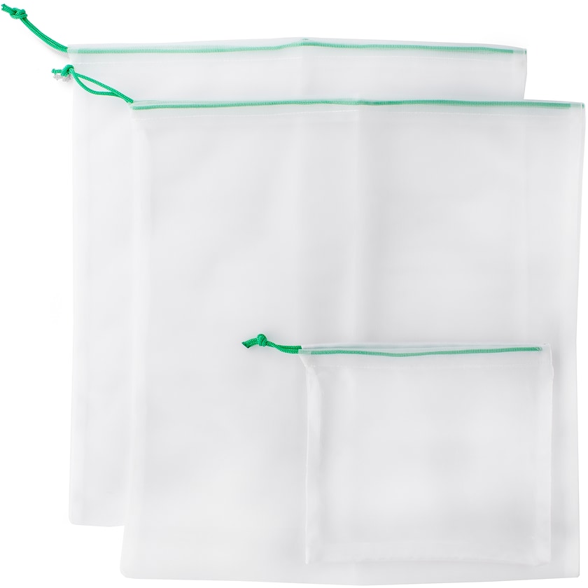 Set di buste per la frutta. Il set contiene due buste più grandi e una più piccola. Le buste sono realizzate in poliestere riciclato. La più piccola funge anche da custodia per le altre due ed è su di questa che viene realizzata la stampa.