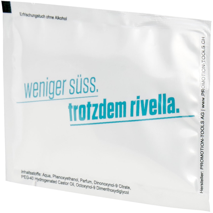 Una salviettina leggermente più grande che può essere ordinato a partire da 1000 pezzi. L'intero pacchetto è stampato con stampa digitale. La salviettina umidificata ha le dimensioni di 150 x 180 mm e poiché non contiene alcol è delicato sulla pelle.