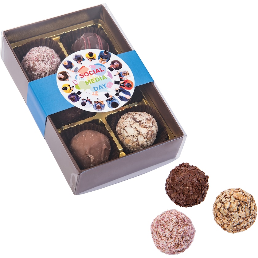 6 cioccolatini in una scatola dal tappo trasparente. I cioccolatini vengono realizzati dopo l'odine e sono in gusti misti. La scatola è dotata di un nastro personalizzato secondo i tuoi desideri.