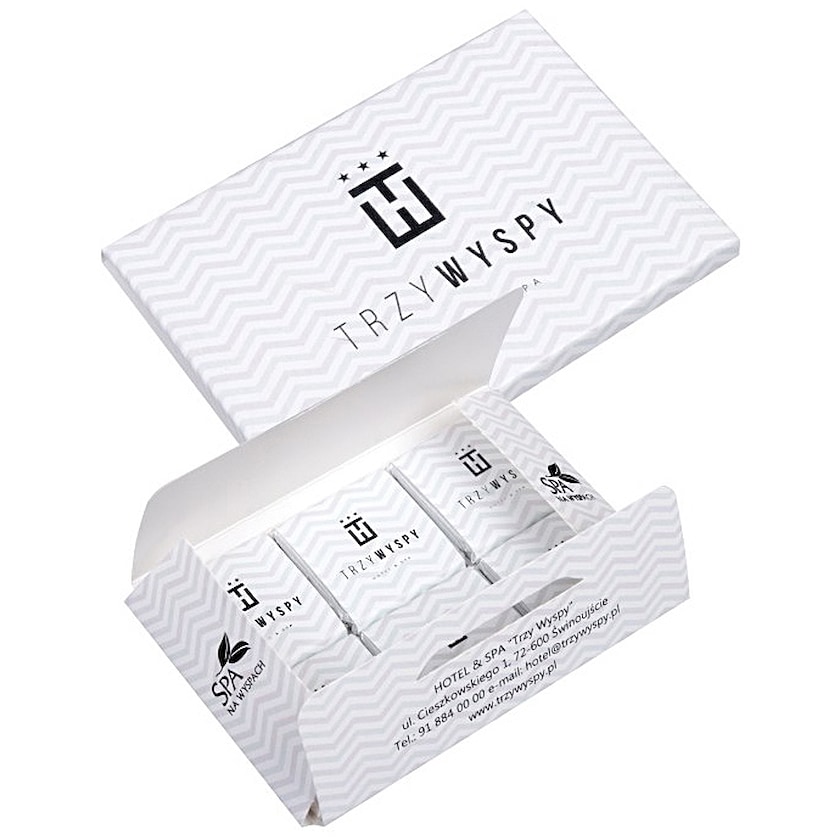 Scatola di cioccolatini con 6 quadratini di cioccolato da 5 grammi. Puoi scegliere l'involucro laminato del cioccolatino in argento, oro, blu, rosso o nero. La scatola e la carta del cioccolatino possono essere stampate con stampa digitale secondo i vostri desideri.