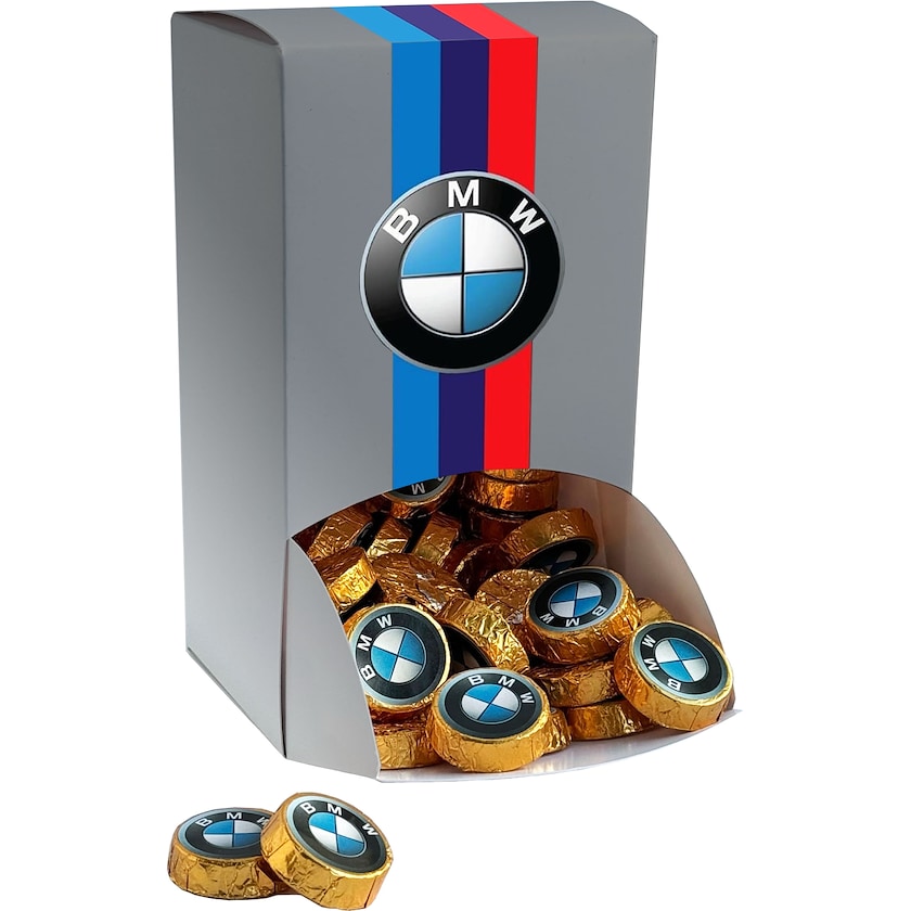 Grande scatola di carta con cioccolatini rotondi in una confezione dorata. I cioccolatini sono in cioccolato di alta qualità con minimo 50% di cacao. L'esterno della scatola viene personalizzata completamente secondo i tuoi desideri. I cioccolatini sono dotati di un'etichetta con il tuo logo.