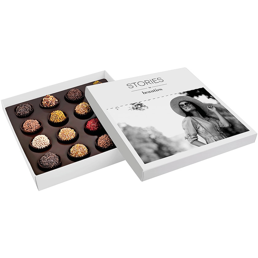 Una scatola di cioccolatini grande con 16 praline di cioccolato Le praline di cioccolato sono di altissima qualità e sono disponibili in gusti misti. La scatola di cioccolatini è stampata con stampa digitale secondo i vostri desideri. Un regalo perfetto per i clienti importanti!